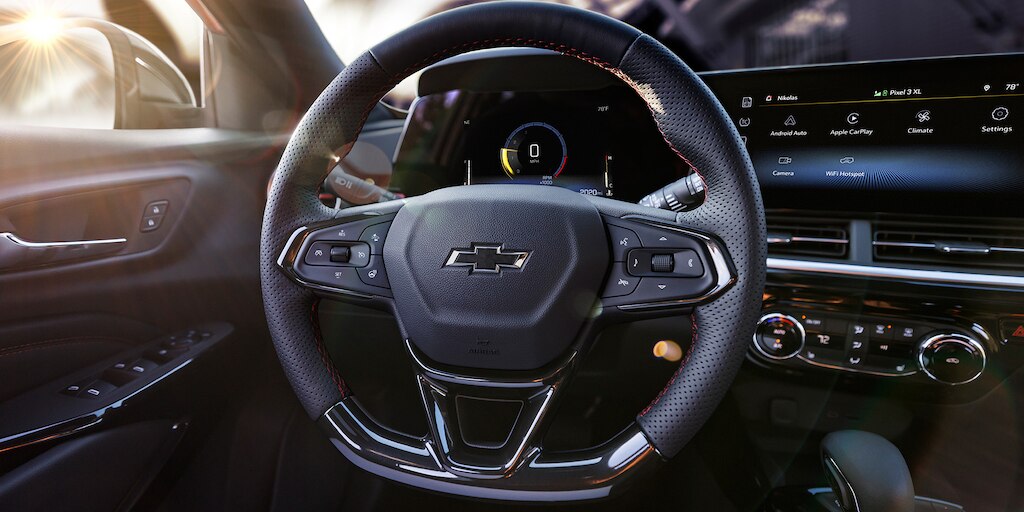 Chevrolet Trax es una SUV con líneas deportivas y elegantes, con parrilla, rines y detalles de interiores exclusivos. La amplia cabina centrada en el conductor fue cuidadosamente rediseñada para alojar dos grandes pantallas al alcance de tu mano, lo cual hace que manejarla sea más cómodo y seguro.